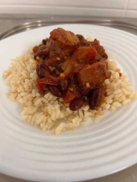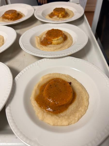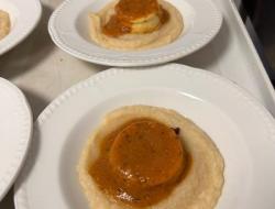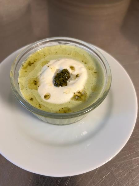 Merci à la cuisine pour ce gaspacho de concombre avec une émulsion de crème et huile de basilic qui apporte une fraicheur. Avec en plat un rougail saucisse et pour les mixés du poisson avec une purée de céleri et sauce rougail.